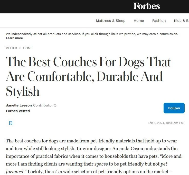 {Interior designer Amanda Cason understands the importance of practical fabrics when it comes to households that have pets. “More and more I am finding clients are wanting their spaces to be pet friendly but not pet forward.”}